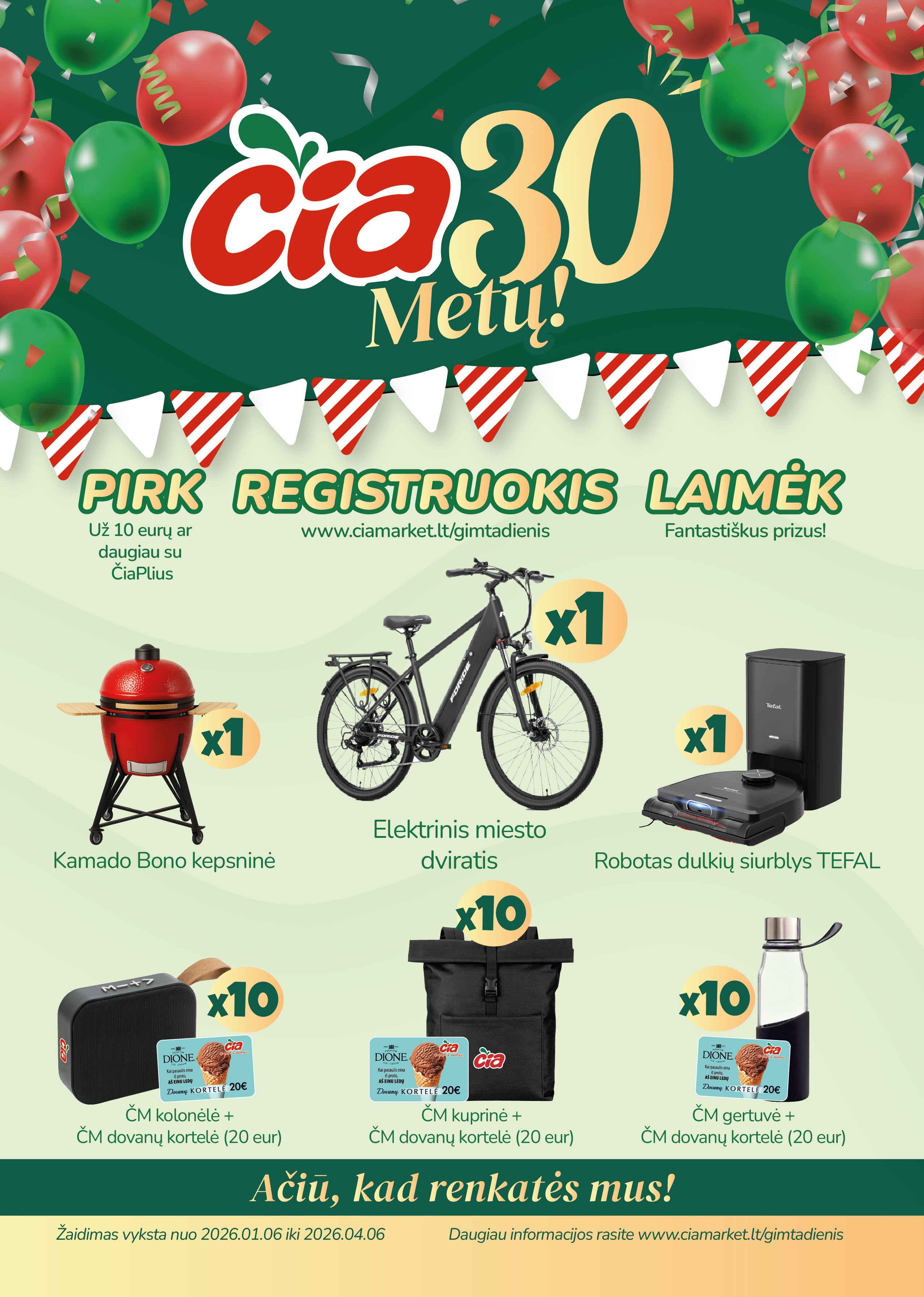 Informuojame, jog Žaidimo dalyviai turi teisę nesutikti, kad Žaidimo administravimo, jo vykdymo, laimėtojų nustatymo bei prizo perdavimo tikslais būtų tvarkomi jų asmens duomenys, ar bet kada atšaukti savo duotą sutikimą tvarkyti asmens duomenis, taip pat susipažinti su savo asmens duomenimis ir kaip jie yra tvarkomi, reikalauti ištaisyti neteisingus, neišsamius, netikslius savo asmens duomenis, susisiekdami su Organizatoriumi el. pašto adresu: info@ciamarket.lt Žaidimo dalyvis nesutikdamas su jo duomenų tvarkymu šiame punkte nurodytais tikslais ir (ar) pareikalavęs nutraukti duomenų tvarkymo veiksmus, praranda teisę dalyvauti Žaidime ir (ar) praranda teisę į Žaidimo prizą.